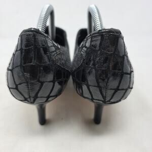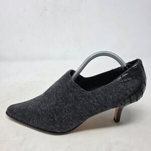 Elegant and modern heeled booties by Donald J Pliner, crafted from premium gray fabric with black faux-croc leather detail on the heel. Features a sleek pointed toe and slim stiletto heel for a refined, sophisticated look. Perfect for office, dinner, or dressy occasions.