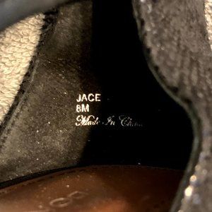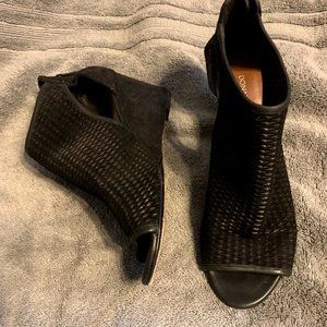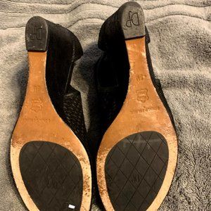 Donald j pliner jace wedge sandal. upper is perfect oiled suede with metallic mini viper print leather back quarter. metal back zip with diamond pull. 2 inch patent covered wedge heel. outsole is buffed leather with rubber insert. fully leather lined. A little wear on one heel (see pic)