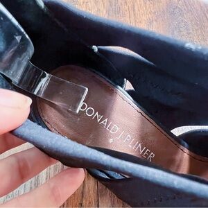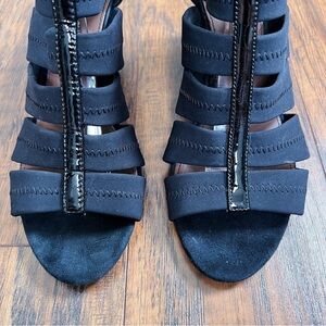 Fabulous wedge heel sandals by designer Donald J Pliner. “Jada” style in black ft caged neoprene scuba straps, zip at back heel, and reptile embossed leather heel. Heel height 2.75”. Size 7.5, great preowned condition - some pulling along zipper on left heel, does not affect wearability (see photos).