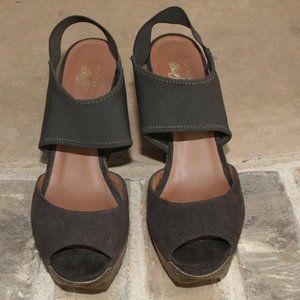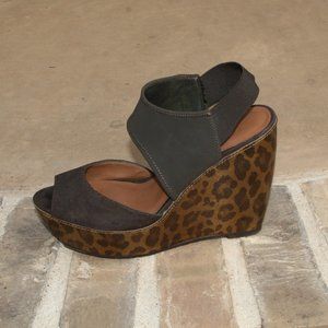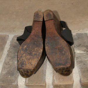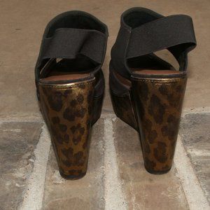 For a fun night out! Good condition w/ some wear. Upper looks very good and so does the leopard wedge (a few marks). The underneath of the ankle strap has wear and so do the bottom soles (not sure why). Ankle strap is elastic. Toe strap is suede leather. Cushioned footbed. Platform and wedge have a metallic sheen. Pic 9 is shoe shown if new. There is no box.
