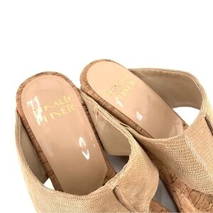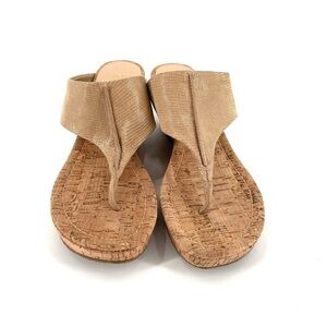A dramatic cork wedge heel and a tumbled metallic brush off leather upper lend a sculptural look to the Gil platform sandal from Donald J. Pliner. This slip-on has open toe and rubber sole that offers enhanced traction.