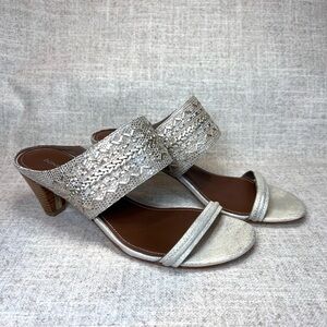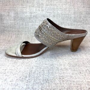 Elevate your style with these stunning Donald J Pliner slip-on heels. The open toe design and mid-height cone-shaped heel provide both comfort and elegance, making them perfect for any occasion, from weddings to parties. The gold metallic finish and classy theme add a touch of glamour to any outfit.