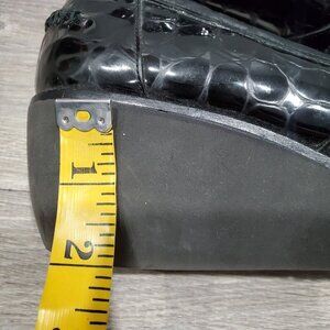 Donald J Pliner Nia2 Black Patent Leather Crocodile Print Wedge Loafer Shoe 8.5M. Please note a few little marks, patent leather rub-off on each shoe, see pictures of toe area. They are very minimal.