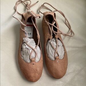 These elegant tan flats from Donald J. Pliner feature a textured leather design with a subtle pattern. The lace-up style allows for a customizable fit, while the rounded toe and flexible sole ensure comfort throughout the day.