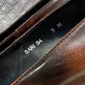 Donald J Pliner "Sari" Heels. Tortoise shell patent, 3.5 inch heel is etched with designer’s logo/signature.