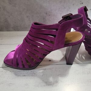 Elegant purple suede heeled sandals w adjustable back strap by Donald J. Pliner. Perfect for your favorite occasion. Approximately 4" fun heel.