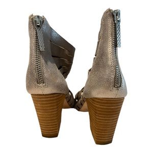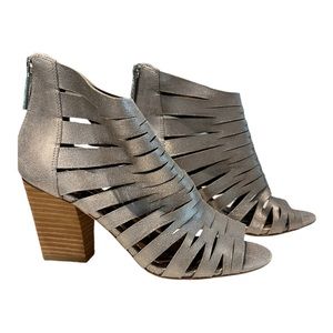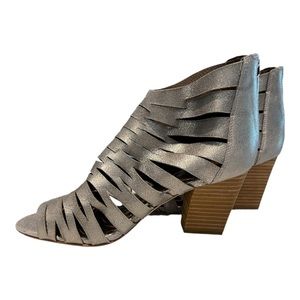 Stylish silver ankle booties with cutout design. Features a sturdy block heel. Perfect for any occasion.