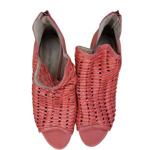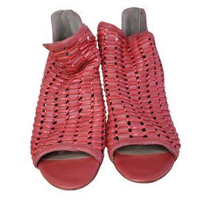 Cute Donald Pliner booties in good condition. Poppy red Jacqi open toe wedge with woven leather and cording, back zip. 3" heel.