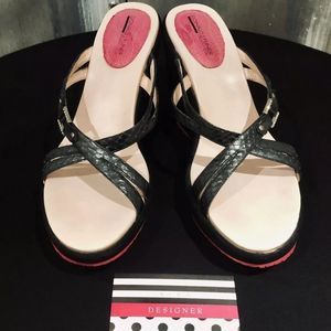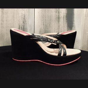Like new cross cross leather subtle snakeskin strap with decorative silver rhinestone buckles. Leather sole, black suede wedge. Measurements in photos. Size 7.5. Retail $125