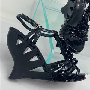 This is a beautiful pair of Donald J Pliner Sz 7.5M Bambi High Wedge Sandals. Black patent leather. Beautiful open toe patent leather floral t strap. Adjustable ankle strap. 4.5” stacked laser cut wood hog wedge. Excellent condition. Worn just a few times. No issues. Very comfortable. Lightly padded leather interior.