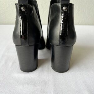 * Features: stacked heel, outer side zipper, black leather, inside elastic panel