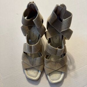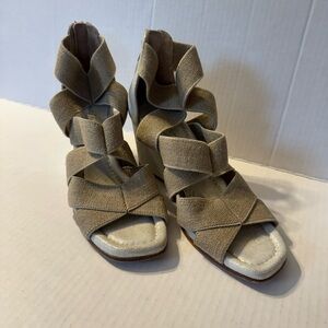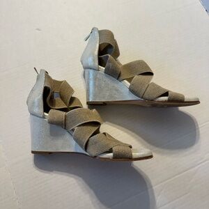 Donald J Pliner Tan Metallic Lelle Strappy Zip Back Peep Toe Wedge Womens 7.5
