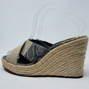 Stylish wedges with a textured design. Features a comfortable tan strap. Black and tan snake pattern accents. Perfect for casual outings.