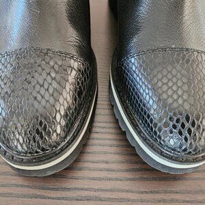 Donald J. Pliner ankle / low calf boot. Black boot with black snake print toe caps.