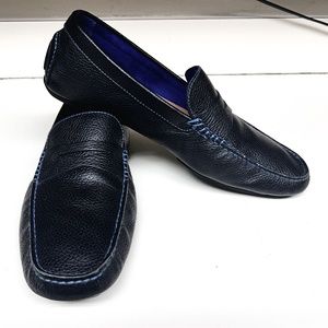 Gently Owned Donald J. Pliner Varran Black Pebbled Leather Driver/Slip-On Moc with Royal Blue Contrast Stitch Detail.