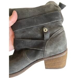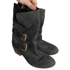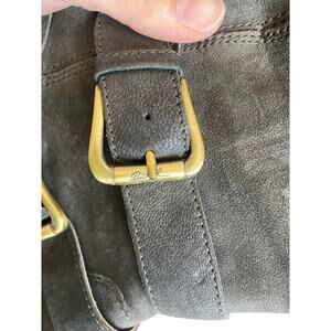 Vintage suede boots with double gold buckle detail. Some light wear, light scuffing on the suede upper typical of this type of material. No other obvious flaws or signs of wear. Heel height is 2 in.