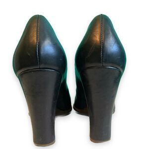 Donald J. Pliner Sport-I-Que Heather Black Leather Wedges size 8.5 have a classic pump silhouette in black, with a rounded toe and a wooden wedge heel. condition: Shows signs of wear including scuffs and scratches on exterior and interior.