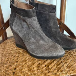 Brownish grey Donald J. Pliner “Chez” suede 3” inch edge heel booties with back zipper- gently used condition!