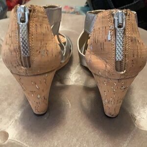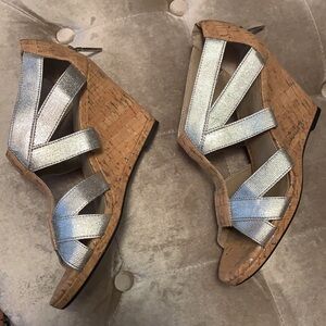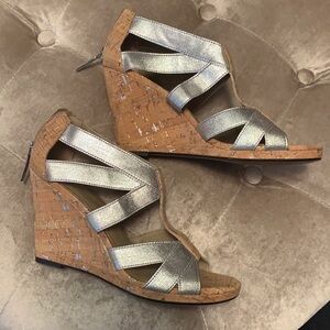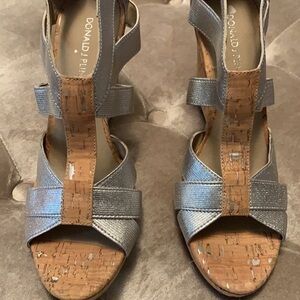 Very gently worn Donald J Pliner wedge shoes with silver straps and cork detailing. These zip up the back and are true to size 7.5. No obvious flaws and these are the great quality leather in DJP shoes. So comfortable.