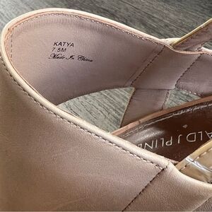 Donald J Pliner Katya Cutout Block Heel Shoes Size 7.5 Tan Neutral Beige Leather with subtle gold metallic accents