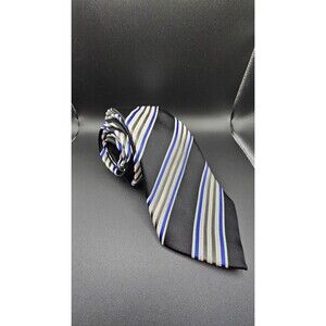 The Donald J. Trump Signature Collection Black Tie with Blue, White, and Gray Accents is a luxurious and stylish accessory for men. Made from 100% silk, this woven tie features a classic striped pattern with medallion accents, reflecting a sense of American presidential style. The tie is handmade and adjustable, making it a versatile and high-quality addition to any formal outfit. Perfect for those who appreciate fine craftsmanship and sophisticated design. Missing Gold DJT bar.