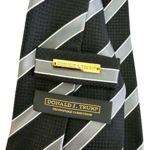 Donald J Trump Signature Collection Black and Gray Striped 100% Silk Tie in excellent used condition. This classic tie is and has great colors of gray and black. Measures approx 58” inches long and 4” wide at the end!