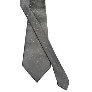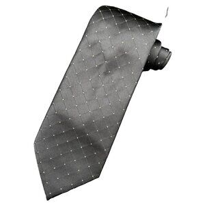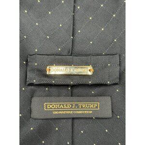 The product is a men's designer tie from the Donald J. Trump Signature Collection, made from 97% silk with a black and gold geometric pattern featuring dot accents. The tie is hand-made in China and is adjustable, with a medallion, embroidered logo, and is 59" in length and 3 5/8" in width. It is a high-quality accessory for men looking to make a stylish statement with their outfit.