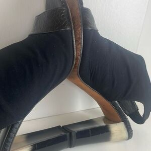 Additional Details: Lizard embossed leather trim around toe area, stretch nylon fabric uppers with elastic slingback strap, unique two-tone shiny heels. Style is called "MINK".