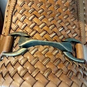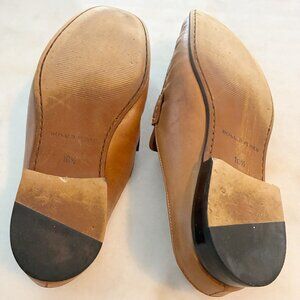 These Donald Pilner Men's Woven Tan Leather Slip-On Mules are size 10.5. These slip-on mules have a low back heel, woven leather top with an antique gold metal decorative bar and beautiful smooth tan leather throughout upper and soles. The right foot has a nick on the middle of the heel- see photo. They are in good condition.