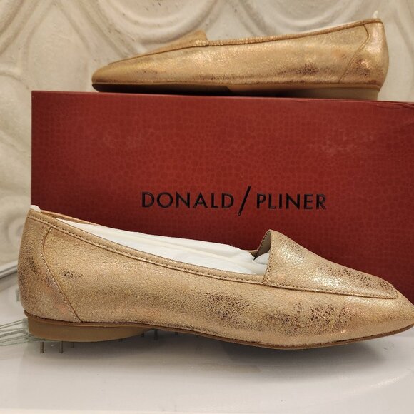 Donald Pliner Bronze Leather Flats. NIB. Size 6. Brand new in original box/packaging. No rips/stains/scuffs/tears/peeling/wear or flaws. Box has very minor damage. Smoke free home. No odors. All offers are welcome. Thank you!