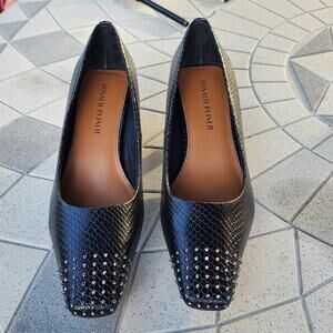 NIP: Stylish, black "Cristine" leather embossed snakeskin print pumps with studded detail accent / square toe / leather sole & insole / kitten square heel / original packaging by Donald Pliner.