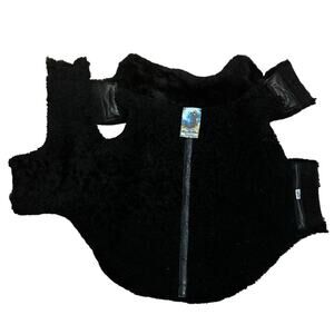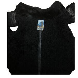 What a lovely cute fancy dog coat, black suede lined in black sherpa trimmed with leather. no fabric tag however. Comes with a matching wooden hangar.