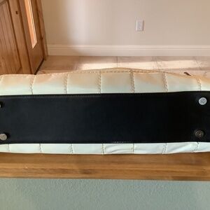 Unique handbag in a butter cream color. The bag measures 15” X 10” X 3”. The bag is in good condition and was only used a couple times. It has been in storage and unfortunately there are some marks on the back of the bag that I believe were caused by the black handles (see photos) This is reflected in the price. Includes Donald Pliner dust bag.