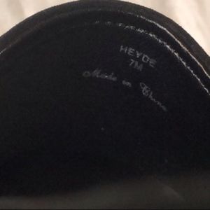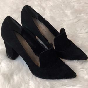 A unique suede loafer pump is elevated by covered block heel for a simple, yet refined elegant attire.