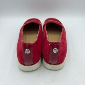 Donald Pliner MAY Red Elastic Stretch Faux Suede Flats Size 7.5 M Women Slip On. Suede with elastic bands. Almond toe. White soles. Patent leather and leather detail. Very good preowned condition.