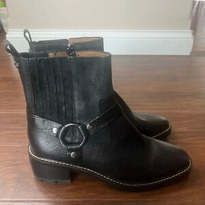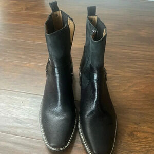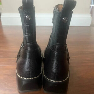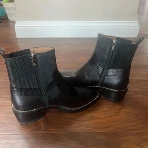 Brand new, no no box black leather booties. These are very chic and stylish boots for every season. If you want that biker look or if you want that classy grunge look with a nice dress or if you just want a nice pair of boots to wear with the jeans these are for you! The leather on these is super soft. If you know, Donald Piner, he makes a great shoe, excellent craftsmanship. These are a women’s size 8 1/2, never worn. The bottom is rubber the heel is wood/ rubber lug style. These have a zip closure with and a back pull tab for easy easy on easy off. The insole of the shoe has cushiony memory foam and the heel is 1.75 inches. Silver hardware on exterior of each boot on the outside of the ankle. All of my items are well cared for and from a smoke-free home. Offers are welcome. Thanks for looking.