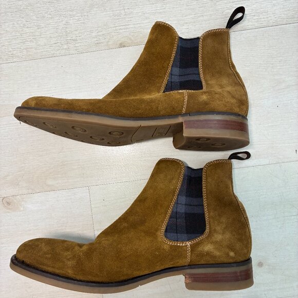 These Donald Pliner Men's Brown/Olive Suede Ankle Boots are size 10.5M. These slip -on suede boots have plaid elastic bands for easy on and off. They are handmade from 100% cowhide- outers and inter soles -all leather. The heels are rubber.