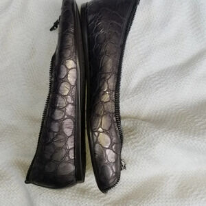 Gorg croc style pewter leather with zipper accents and peep toe. I bundle shoes up to but not over 5 pounds.