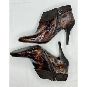 Donald Pliner Rula Alligator Patent Leather Ankle Boots Brown Suede Trim Sz 8.5