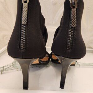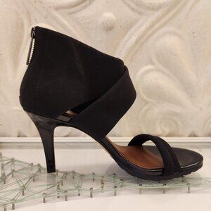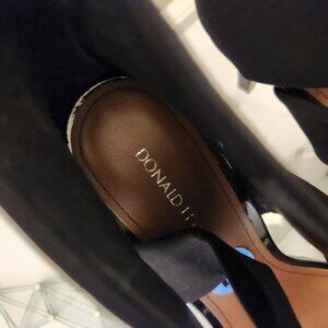 Donald Pliner "Tilly" Heeled Sandals. NWT. Size 7.5. No rips/stains/scuffs/tears/peeling or wear. The only tags are the sticker tags, not in original box. Retail: 145, on sale at TJ Max for 99.00. Back zips. Heel height: 3.5 inches. Almond toe. Fabric and Leather sole. So nice. Some silver writing on the bottoms. Smoke free home. No odors. All offers are welcome. Has the traction on the bottoms, love that, no sound when walking! Thank you!