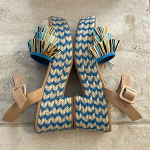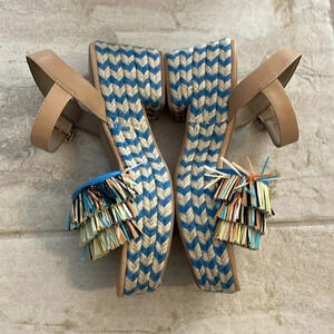 Your tropical vacation is calling and said to walk these on up to the tiki or margarita bar! The colors and style are so fun and you can’t go wrong with the designer brand! Ankle strap closure and 3” platform heel. Wore once for a dinner.