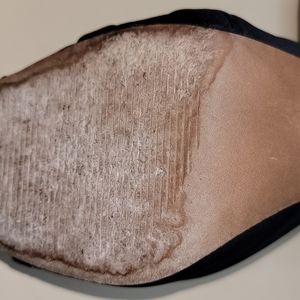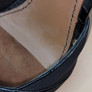 aprox. 2 1/2 inch heel. Suede toe pad built into the shoe. Fabric with Napa leather piping and full embossed leather back.
