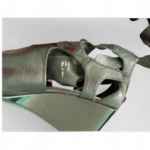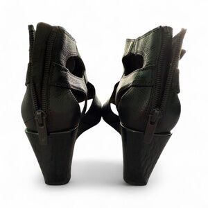 Trendy pair of Donald Pliner women's shoes in size 9.5, featuring a black open toe design. These heels have a wedge heel style, made of leather material. The stylish and sophisticated look of these shoes make them perfect for various occasions, adding a touch of elegance to any outfit. Note the back zipper for quick on and off. The heel has no scratches and sole is in prestine condition. Great look for ankle jeans, or trendy dress.