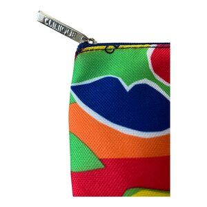 Brighten up your beauty routine with this Donald Robertson x Clinique cosmetic bag. Featuring a bold fruit and lip print on a striped background, this colorful pouch has a smooth zip closure and a sunny yellow lining. Perfect for storing makeup, skincare, or travel essentials.