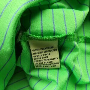 Pinhole in upper back from thrift store tag being removed. There is this "shiny line" on back bottom that's only visible in a certain light from a certain angle. Tiny faint orangeish dot below buttons. Very good condition.