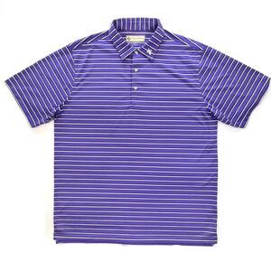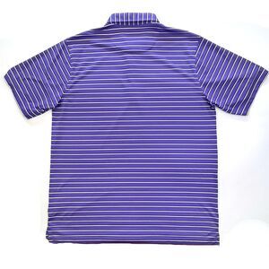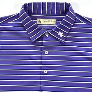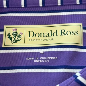 This Donald Ross Men's XL Polo offers a classic stripe pattern in purple, white, and blue. Crafted for comfort with a 3-button placket and drop hemline, it features an embroidered collar logo and performance fabric.