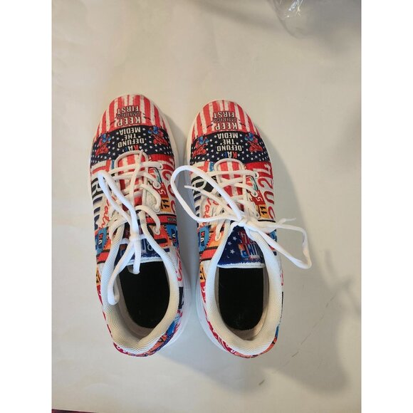 Unisex women's Men sneakers feature a bold patriotic print with phrases supporting social causes. Designed for comfort and durability lightweight and breathable, they are perfect for everyday wear or casual outings. Durable cushioned sole for added comfort. The lace-up closure provides a secure fit, while the cushioned sole ensures ease with every step.