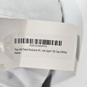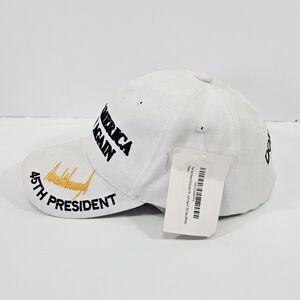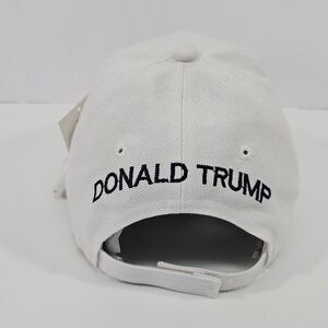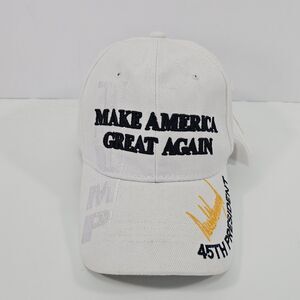 Classic white "Make America Great Again" cap honoring the 45th President. Crafted from a durable blend of 55% cotton and 45% polyester, this structured six-panel unisex hat features bold raised embroidery across the crown, visor, and back. The curved brim sports a gold embroidered signature and "45th President" detail, while the adjustable Velcro strap ensures a comfortable, personalized fit for any head size. Interior taping includes additional stitched branding. Condition is new with original retail tags attachedsome marks from syorage are present. Great for collectors, rallies, events, or everyday patriotic style.