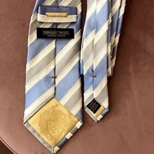 Donald Trump Signature Collection silk tie in blue, silver, white stripes. Very well made tie! Lightly used, I examined super close and noticed some ultra small marks, see close up photos for details, very hard to notice but wanted to mention. Otherwise in great condition. You will receive the exact item pictured, it will be carefully packaged for safe shipment to you. Please review all photos as they are included as part of the description. Smoke free home, feel free to ask any questions!