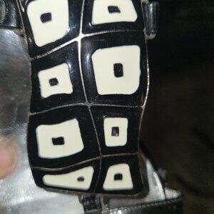 These Donald Pliner couture black and white patent leather and silver strappy stiletto sandals have a 3-inch heel and metal artwork on the front. The metal decoration is solid with an enamel white and black abstract design. Very comfortable.